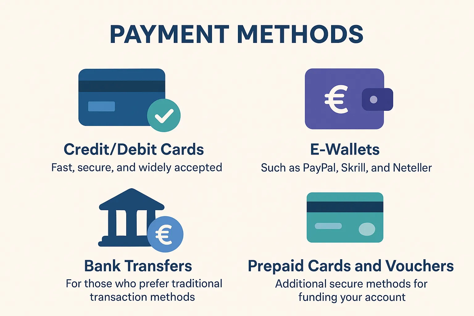 - E-Wallets: Such as PayPal, Skrill, and Neteller.