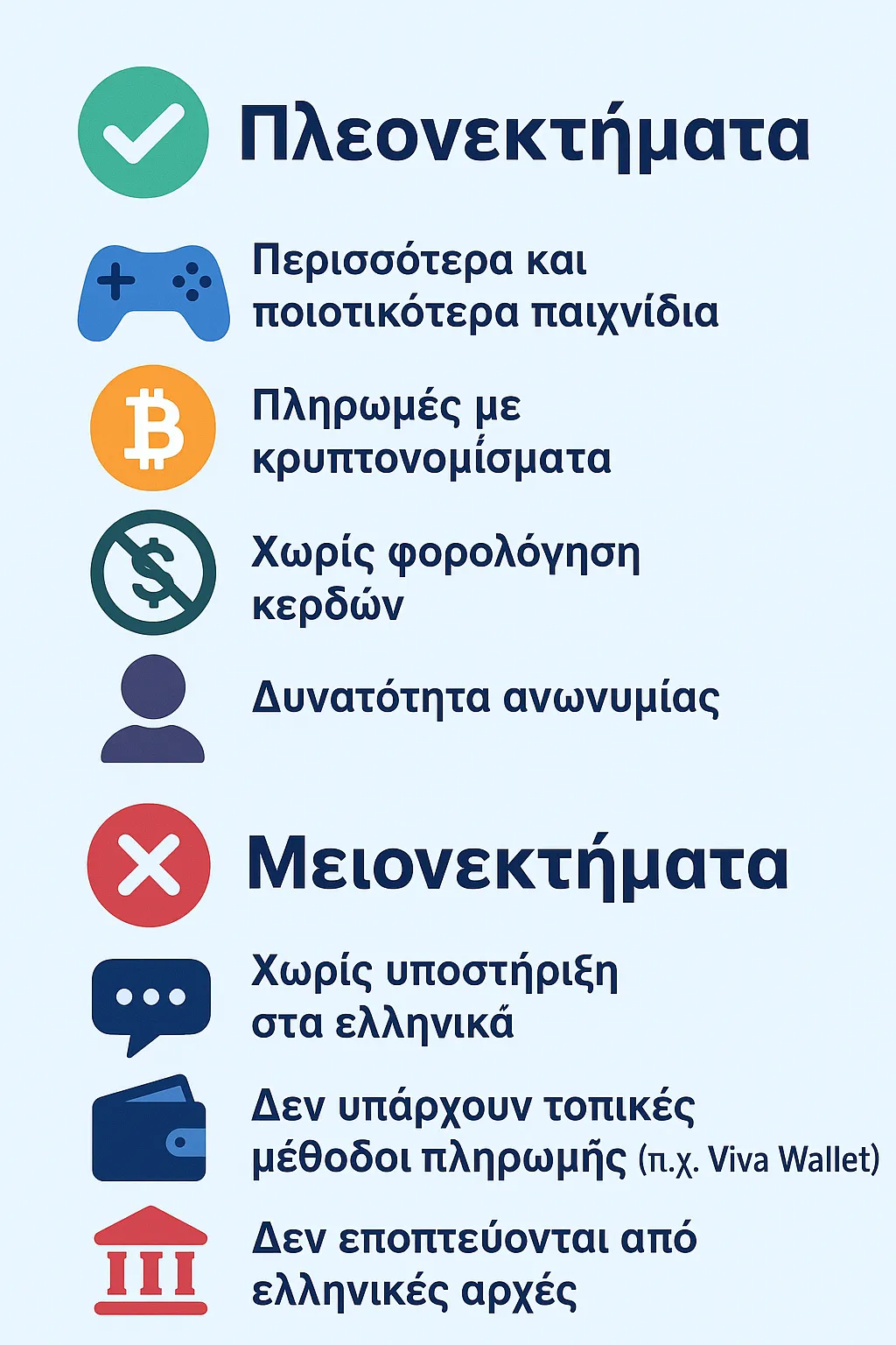 Από την άλλη σίγουρα τα ελληνικά καζίνο έχουν εξυπηρέτηση πελατών στα ελληνικά που είναι αμφίβολη στα online casino εξωτερικού. Κάποιες συγκεκριμένες μέθοδοι όπως το Viva Wallet είναι αποκλειστικά διαθέσιμο στην Ελλάδα. Τέλος ένα σημαντικό μειονέκτημα των ξένων καζίνο είναι πως δεν είναι υπό τον έλεγχο του ελληνικού δημοσίου, συνεπώς δεν μπορεί κανείς να στείλει κάποιο αίτημα ή παράπονο στην ελληνική ρυθμιστική αρχή, παρά μόνο σε διεθνή όργανα εφόσον προκύψει κάποιο πρόβλημα.